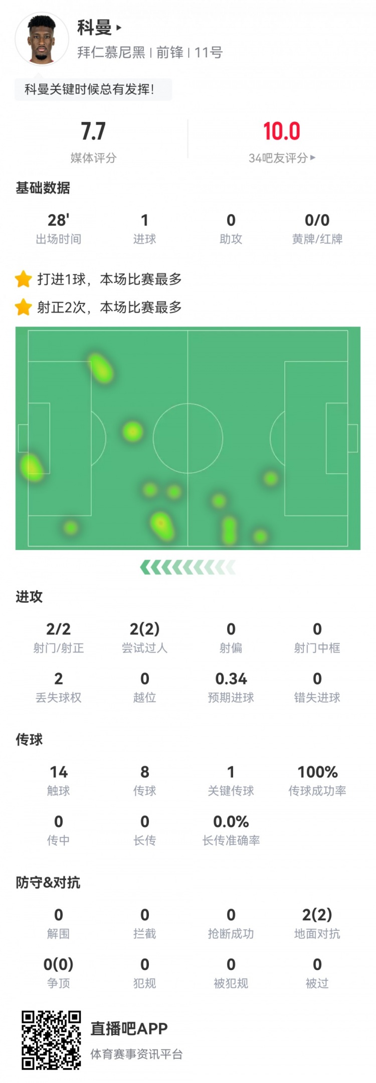 3月1日訊 本輪德甲,拜仁3-1逆轉(zhuǎn)客勝斯圖加特。此役科曼替補(bǔ)登場28分鐘,球員全場重點(diǎn)數(shù)據(jù)如下↓