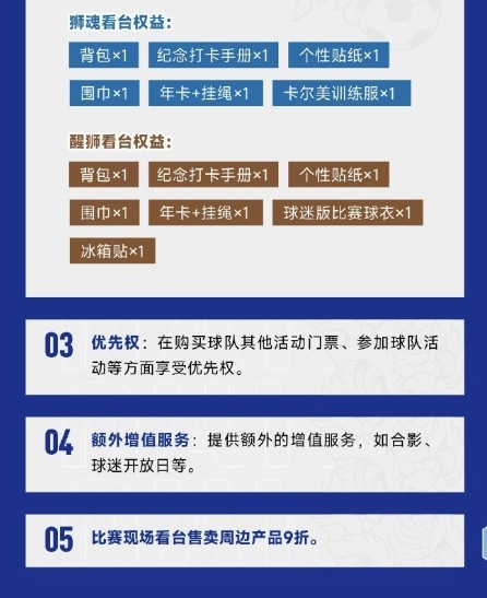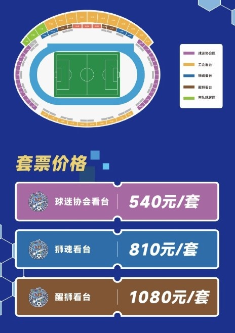 其中,球迷協(xié)會(huì)看臺(tái)540元/套,獅魂看臺(tái)810元/套,醒獅看臺(tái)1080元/套。