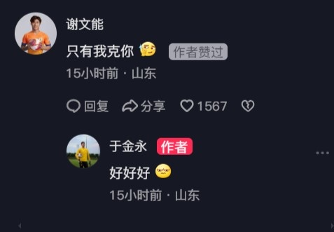 在評論區(qū),U20國足前鋒杜月徵與他互動,杜月徵評論道,你是真好,于金永則回復你最好。謝文能也出現(xiàn)在評論區(qū),他寫道:“只有我克你”,于金永則回復好好好。