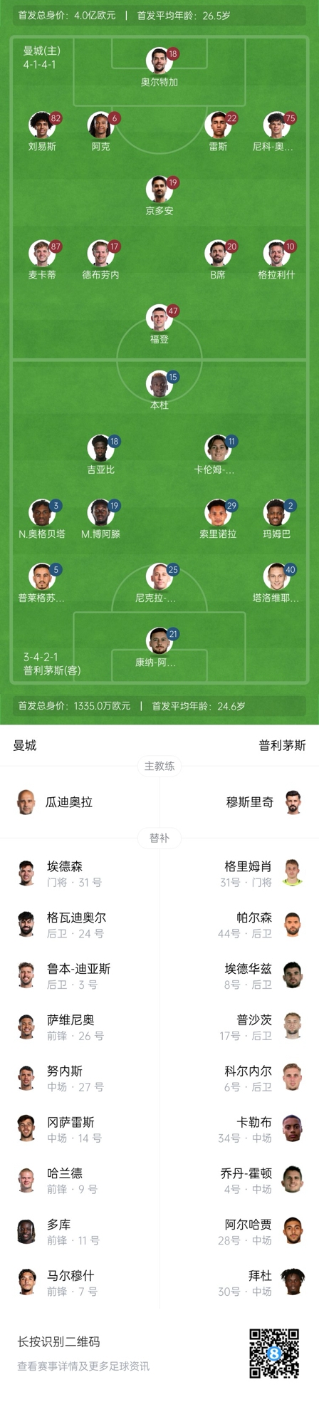 曼城首發(fā):18-奧爾特加、82-劉易斯、22-雷斯、6-阿克、75-奧賴利、19-京多安、17-德布勞內(nèi)、87-麥卡蒂、20-B-席爾瓦、10-格拉利什、47-福登