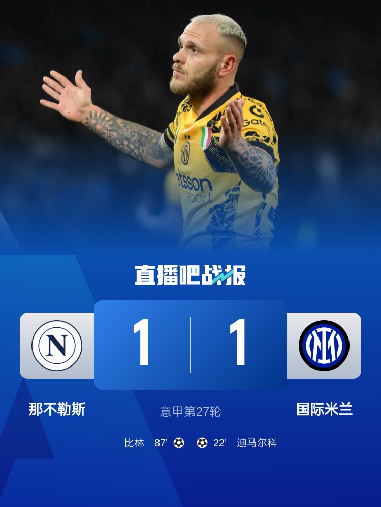 意甲本輪焦點大戰(zhàn),那不勒斯主場1-1戰(zhàn)平國米,雙方進球者為比林和迪馬爾科,國米方面迪馬爾科和恰20均傷退。