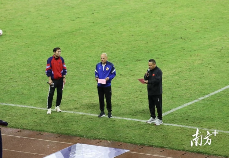 梅州客家主場對陣河南隊(duì)的比賽上半場,梅州客家以2-0的比分領(lǐng)先。中場休息時(shí),來自梅州的三位足球名宿王惠良、池明華、謝育新出現(xiàn)在賽場上,用真摯樸實(shí)的話語為梅州客家加油。