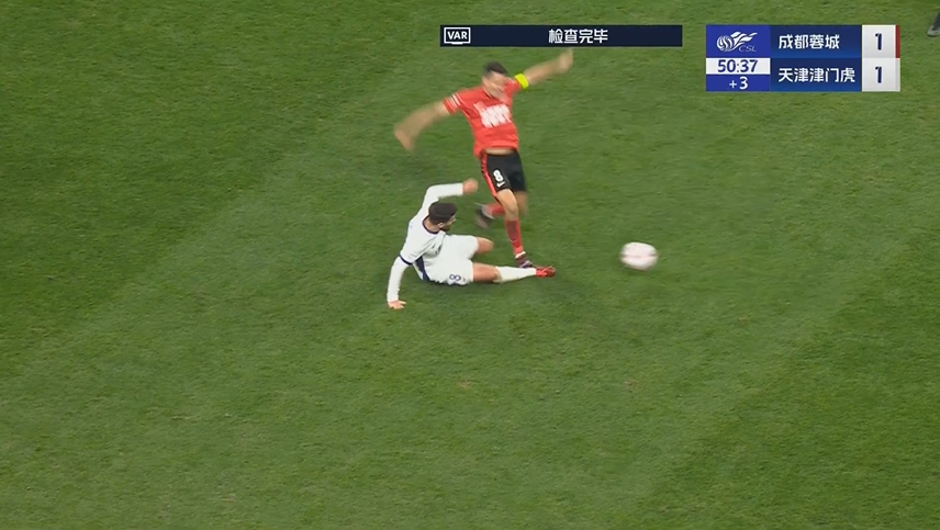 上半場傷停補(bǔ)時階段,周定洋在爭搶中踩中哈達(dá)斯小腿,隨后VAR介入,主裁去場邊回看后,出示紅牌將周定洋紅牌罰下!場上比分蓉城1-1津門虎。