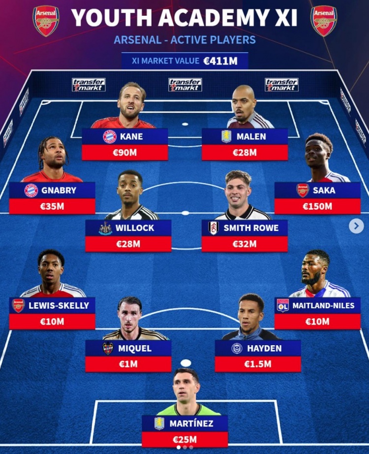 阿森納青訓(xùn)當(dāng)前最貴陣:總身價(jià)4.11億歐元