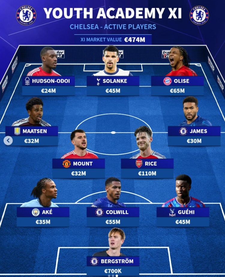 切爾西青訓(xùn)當(dāng)前身價(jià)最貴陣:總身價(jià)4.74億歐元