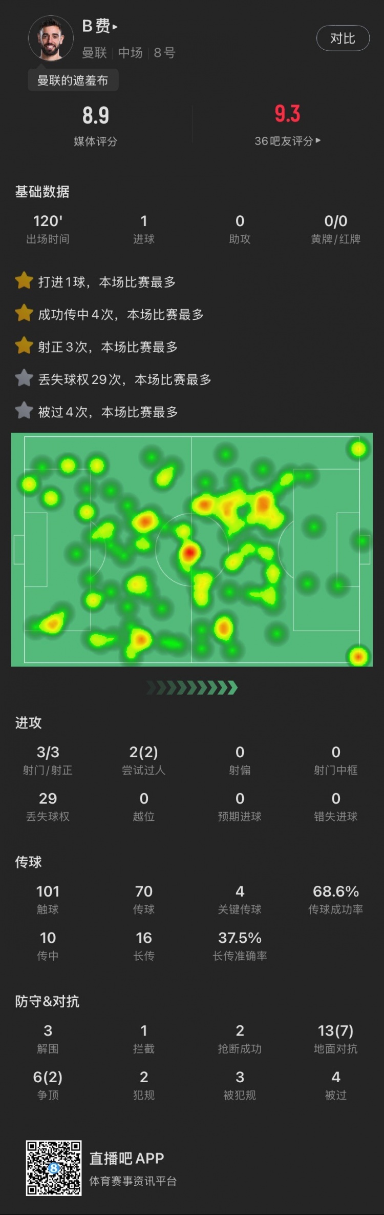 3月3日訊 足總杯1/8決賽,曼聯(lián)點(diǎn)球大戰(zhàn)不敵富勒姆。本場比賽,B費(fèi)打滿120分鐘,幫助曼聯(lián)扳平比分,并在點(diǎn)球大戰(zhàn)中主罰命中。