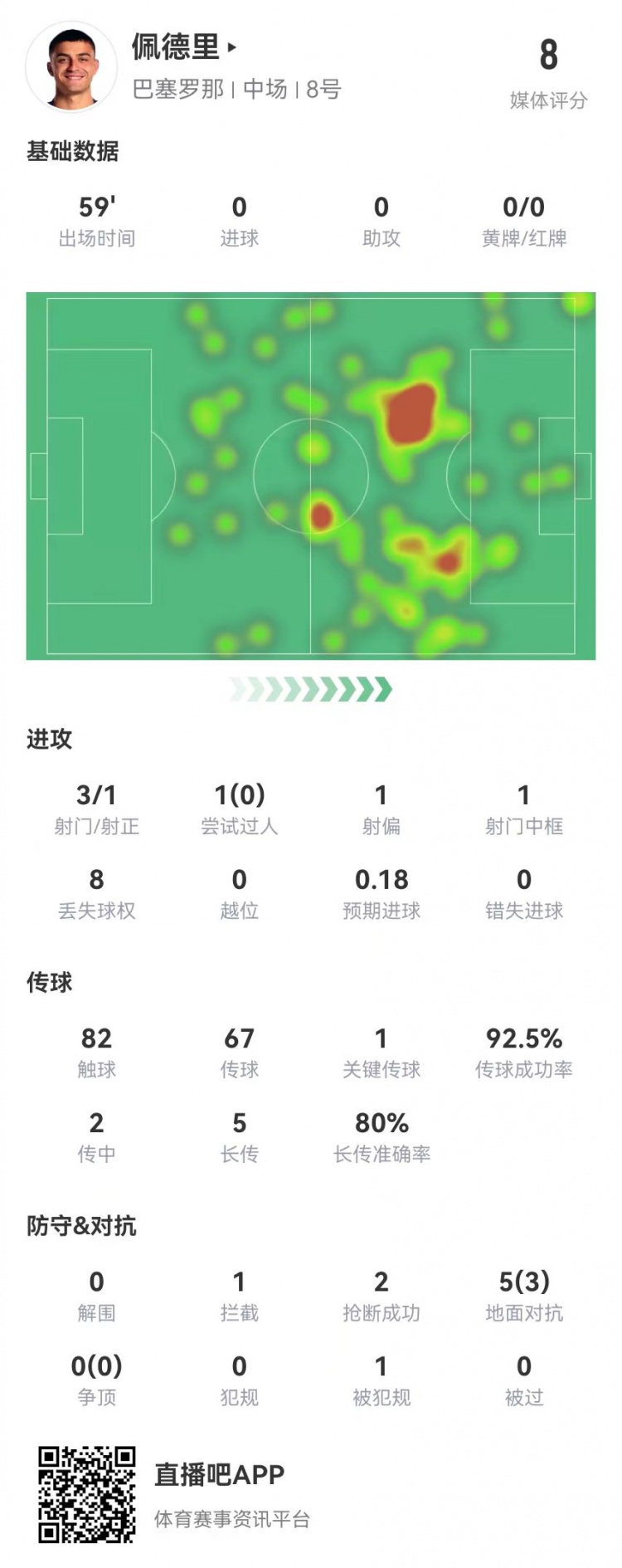 3月3日訊 巴薩在本輪西甲4-0領先皇社,佩德里本場數(shù)據(jù)如下: