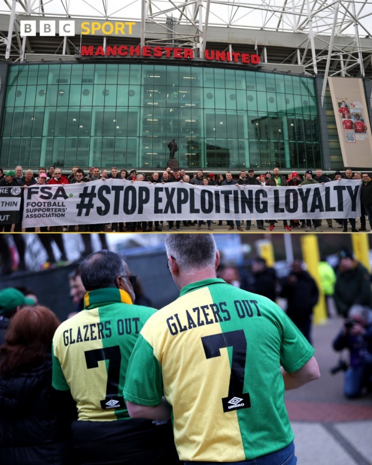 比賽開始前,兩隊球迷在老特拉福德球場前進行了聯(lián)合抗議活動,拉出了寫有“停止剝削忠誠”的橫幅。此外,也有部分曼聯(lián)球迷仍在堅持表達對格雷澤家族的不滿,他們穿上了印有“格雷澤滾蛋”的球衣。