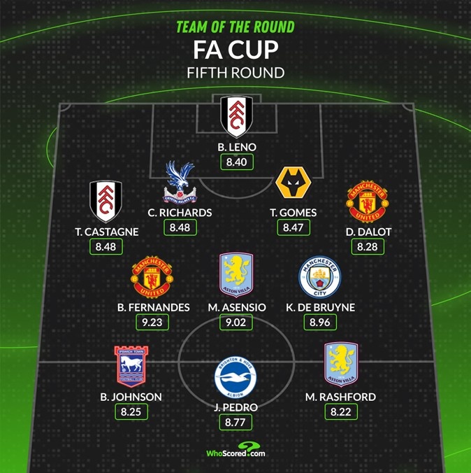 3月4日訊 足總杯十六強(qiáng)戰(zhàn)已經(jīng)完賽,whoscored也統(tǒng)計(jì)了本輪足總杯評(píng)分最佳陣容,富勒姆、維拉和曼聯(lián)各2人入圍。