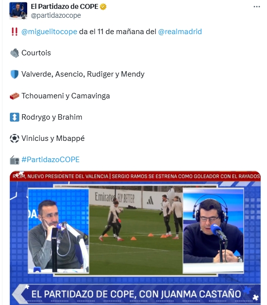 科貝電臺透露皇馬首發(fā):庫爾圖瓦、巴爾韋德、勞爾-阿森西奧、呂迪格、門迪、瓊阿梅尼、卡馬文加、羅德里戈、迪亞斯、維尼修斯、姆巴佩