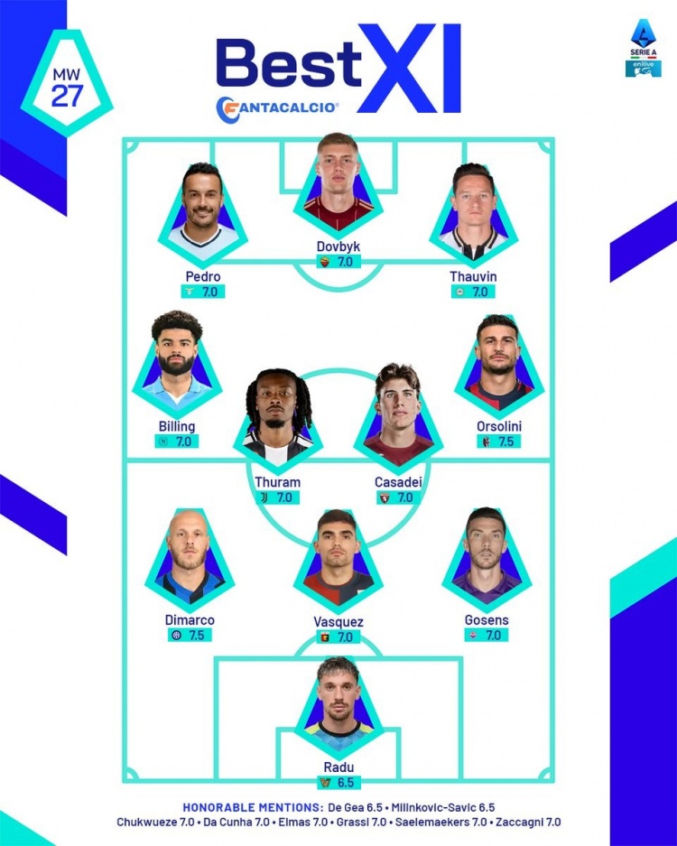 3月5日訊 意甲第27輪聯(lián)賽已經(jīng)戰(zhàn)罷,意甲官方也評出了本輪聯(lián)賽最佳陣容,K-圖拉姆、迪馬爾科領(lǐng)銜。