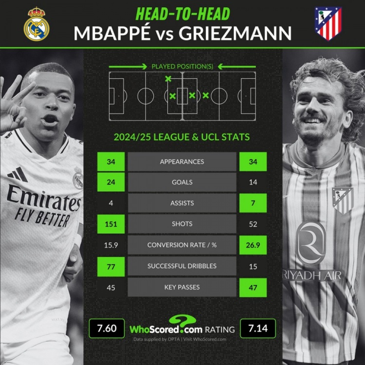 3月5日訊 歐冠十六強戰(zhàn)將上演馬德里同城德比,whoscored也對比了姆巴佩和格列茲曼本賽季的關鍵數(shù)據(jù)。