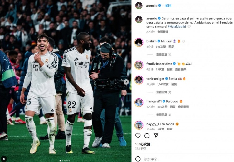 勞爾-阿森西奧配文道:“我們在主場贏下了首回合,但下周還會有一場鏖戰(zhàn)。伯納烏的氛圍一如既往地?zé)崃?!?/p>
