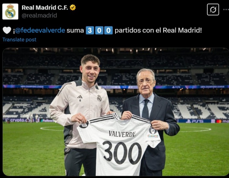 巴爾韋德也獲贈印有300號的定制球衣,并與主席弗洛倫蒂諾合影留念?;蜀R官推也曬出雙方合影,配文寫道:“巴爾韋德在皇馬的300場比賽。”