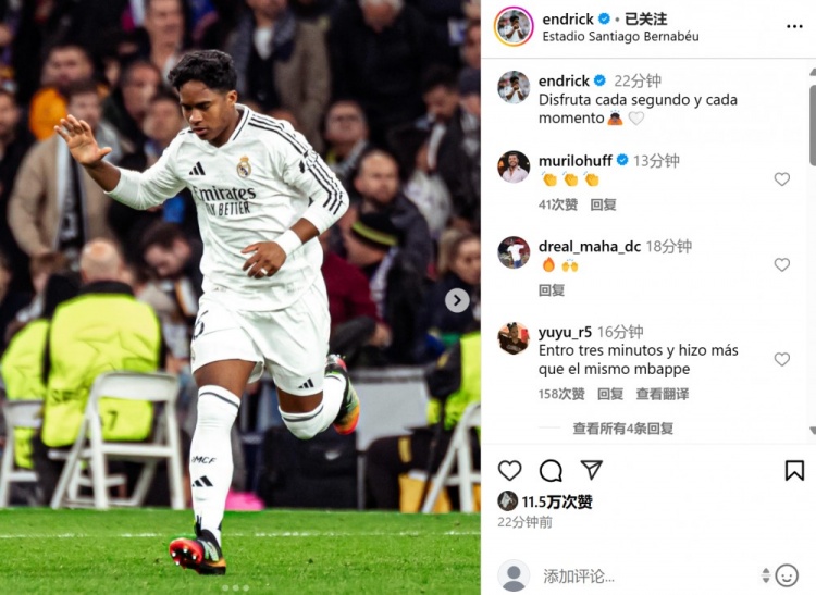 3月5日訊 在本輪歐冠,皇馬2-1擊敗馬競。本場比賽恩德里克在最后時刻替補(bǔ)登場,迎來個人歐冠淘汰賽首秀。賽后他也在個人社媒曬出本場照片,配文寫道:“享受比賽的每一個瞬間!” 標(biāo)簽: 足球 西甲 皇家馬德里