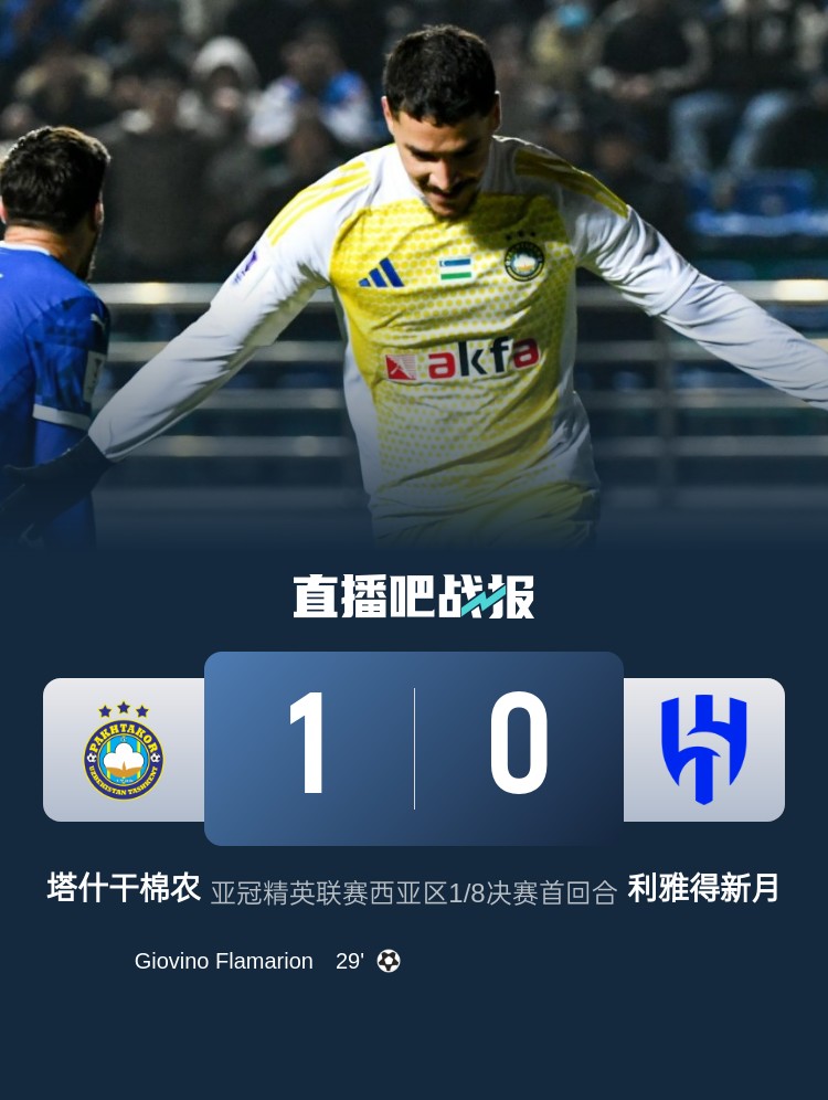 亞冠精英聯賽西亞區(qū)1/8決賽首回合,利雅得新月首回合0-1塔什干棉農。上半場,弗拉馬里昂撞射破門,布萊希傷退;下半場,米林科維奇錯失良機,新月完成一次門線解圍。