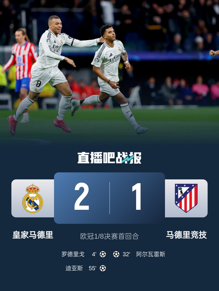 歐冠1/8決賽首回合,皇馬2-1馬競,占據晉級先機。上半場,巴爾韋德助攻羅德里戈內切擺脫防守破門,阿爾瓦雷斯過掉卡馬文加后世界波扳平;下半場,卜拉欣-迪亞斯禁區(qū)內蝴蝶穿花步過人后建功。