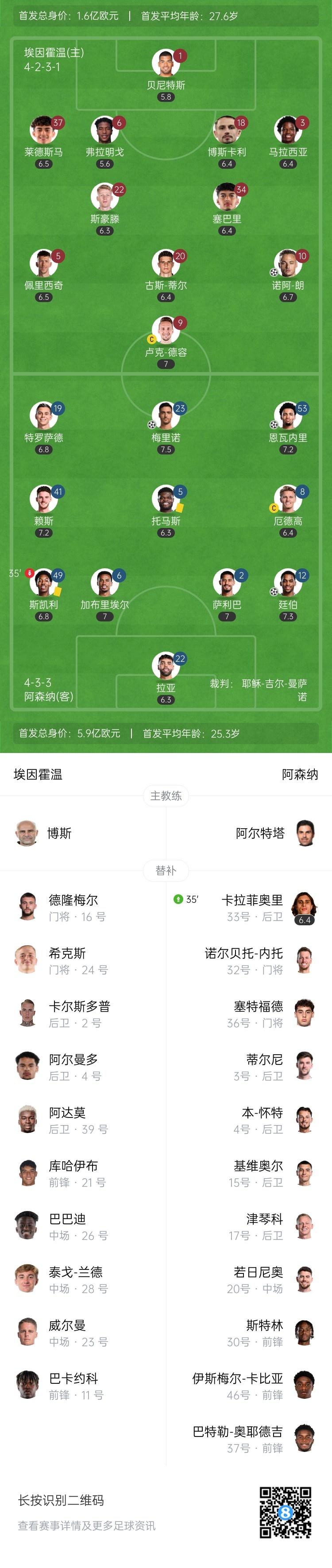 3月5日訊 北京時間4:00,歐冠1/8決賽首回合阿森納客場挑戰(zhàn)埃因霍溫,比賽在飛利浦大球場打響!上半場,廷伯頭球破門首開記錄,恩瓦內里抽射建功;斯凱利染黃;隨后梅里諾再下一城!托馬斯送點,諾阿-朗點射扳回一球。半場結束,阿森納暫時3-1領先埃因霍溫。