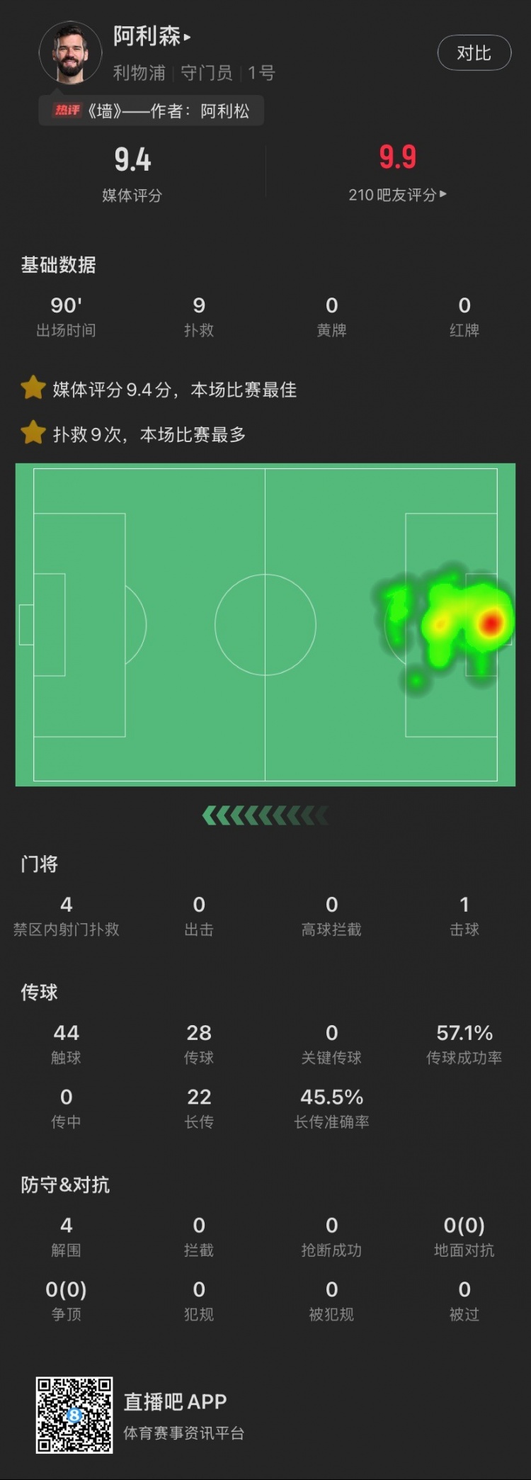 3月6日訊 在剛剛結(jié)束的歐冠1/8決賽中,利物浦1-0絕殺巴黎。本場(chǎng)比賽,巴黎狂轟27腳射門、10腳射正,均被阿利森化解。他獲得了9.4分的評(píng)分,全場(chǎng)最高。