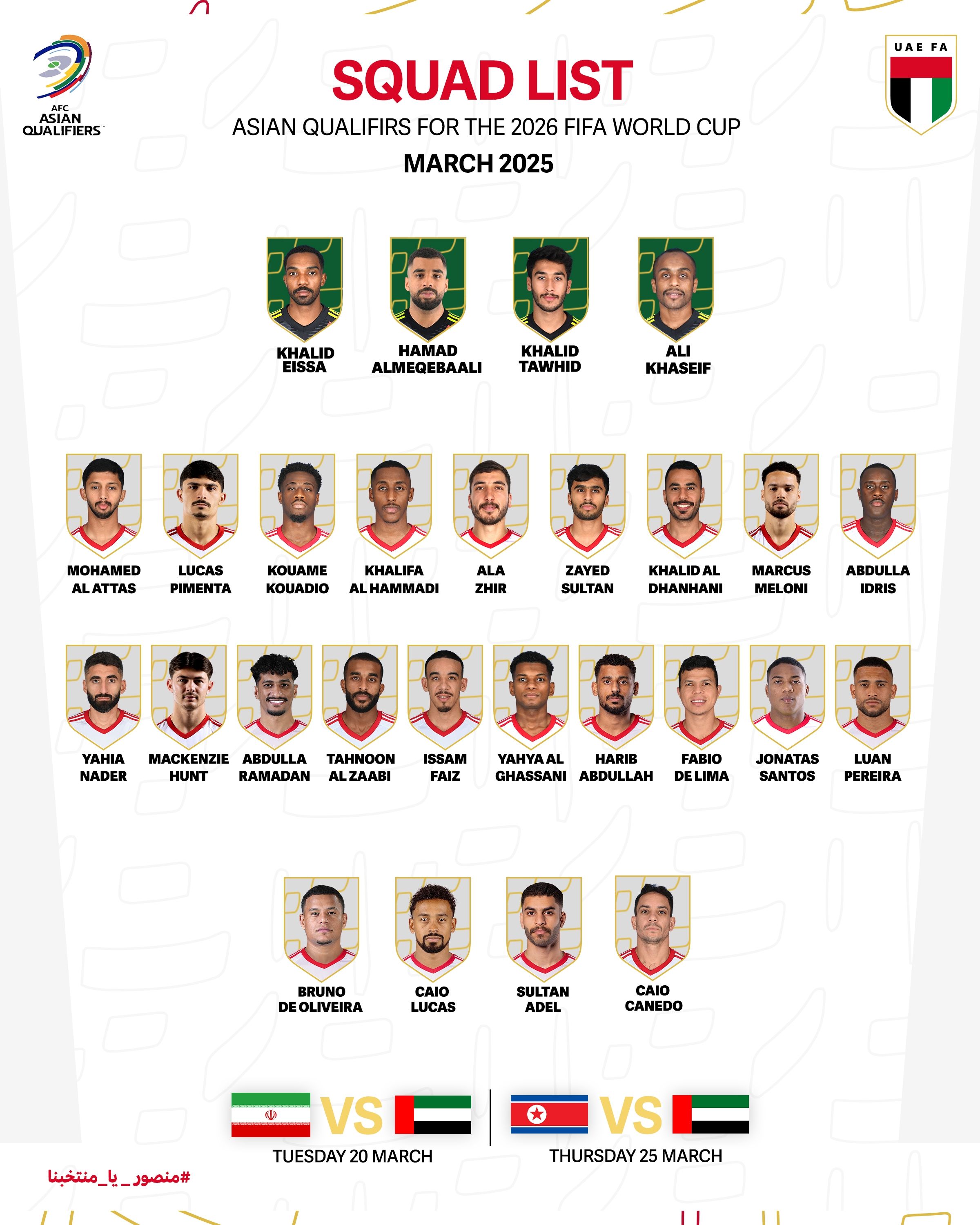 03月06日訊 阿聯(lián)酋公布了3月世預(yù)賽大名單,本月阿聯(lián)酋將于3月21日對(duì)陣伊朗,3月26日對(duì)陣朝鮮。