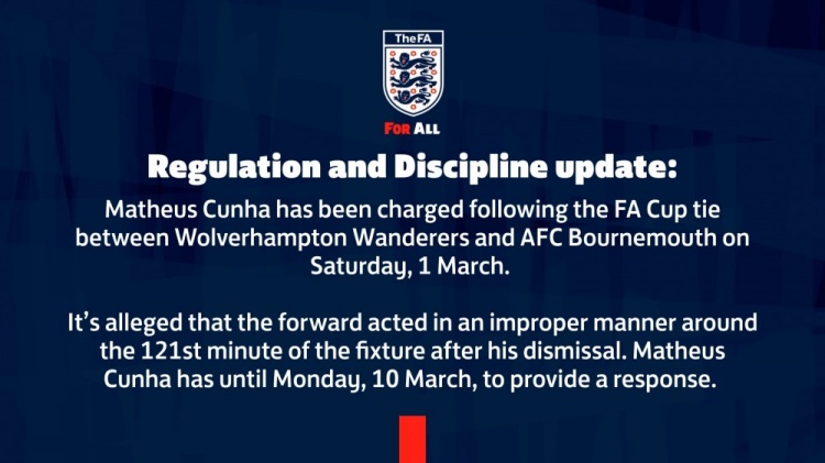 英足總官方表示:“在3月1日足總杯狼隊(duì)對(duì)陣伯恩茅斯的比賽之后,對(duì)庫(kù)尼亞提出指控,這位前鋒在被罰下后行為不當(dāng),他必須在3月10日周一之前做出回應(yīng)?!?/p>