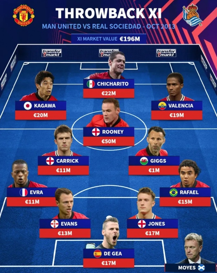 3月7日訊 曼聯(lián)在本輪歐聯(lián)杯對(duì)陣皇家社會(huì),《轉(zhuǎn)會(huì)市場(chǎng)》也列出了曼聯(lián)在2013年10月隊(duì)史首次在歐戰(zhàn)和皇家社會(huì)交手時(shí)的首發(fā)陣容情況。