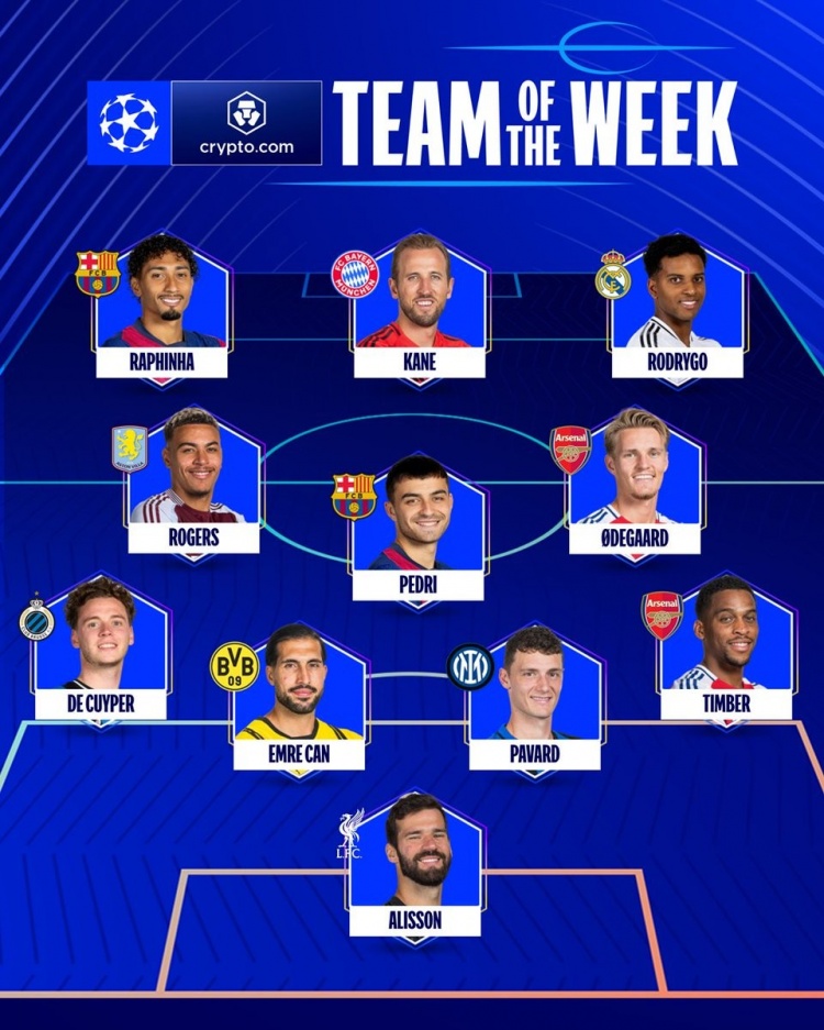 中場:羅杰斯(維拉)、佩德里(巴薩)、厄德高(阿森納)