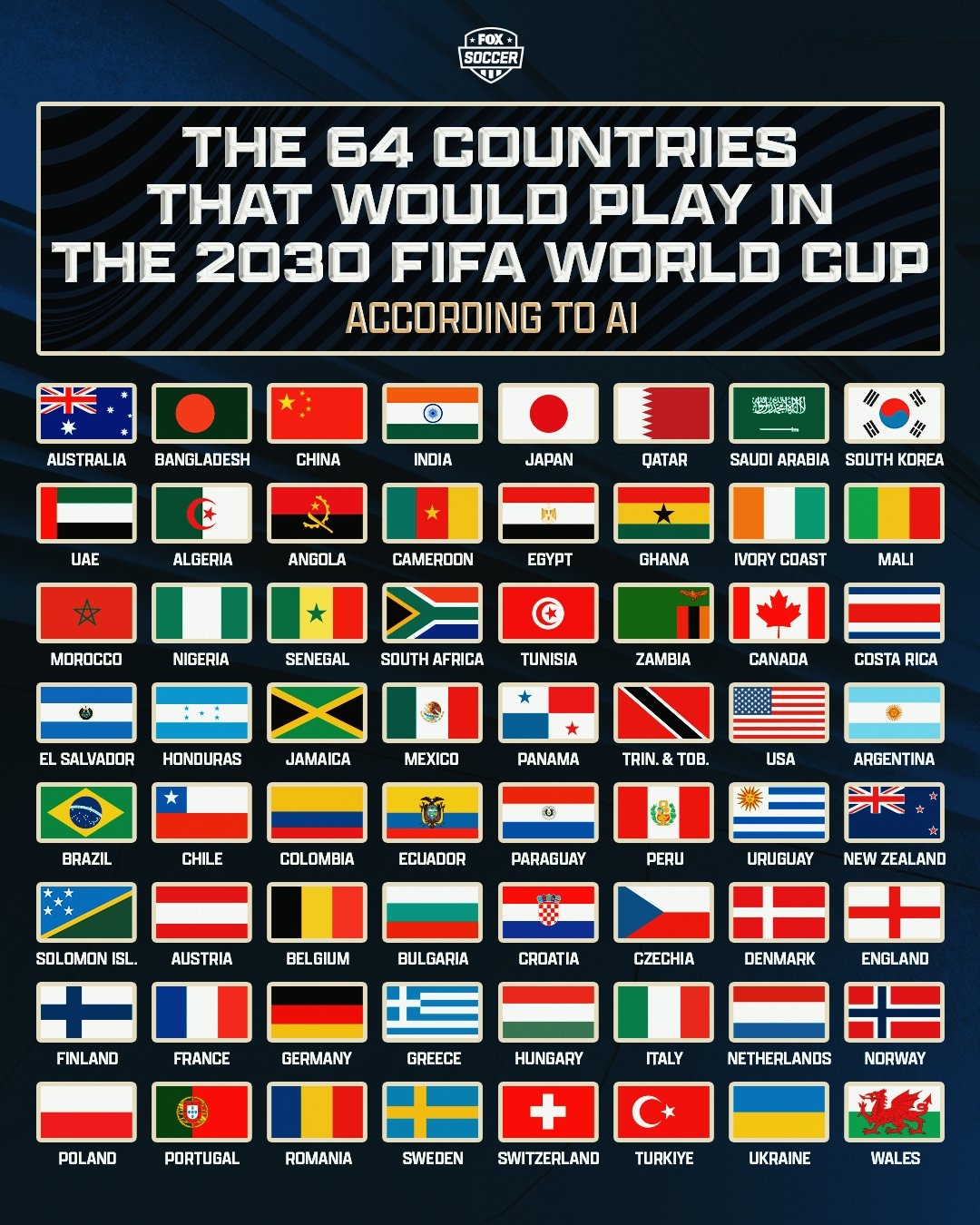 ??怂棺闱虬l(fā)文,表示要求ChatGPT列出如果2030世界杯擴(kuò)軍64支隊后所有的64個國家。同時??怂箤懙溃耗阌X得這種形式是個好主意嗎?