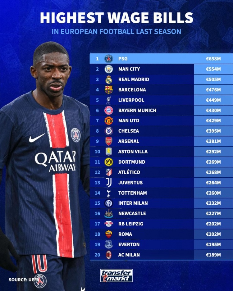 3月7日訊 歐足聯(lián)不久前公布了各俱樂部上賽季薪資情況,《轉(zhuǎn)會市場》也就此列出了榜單,巴黎居首。