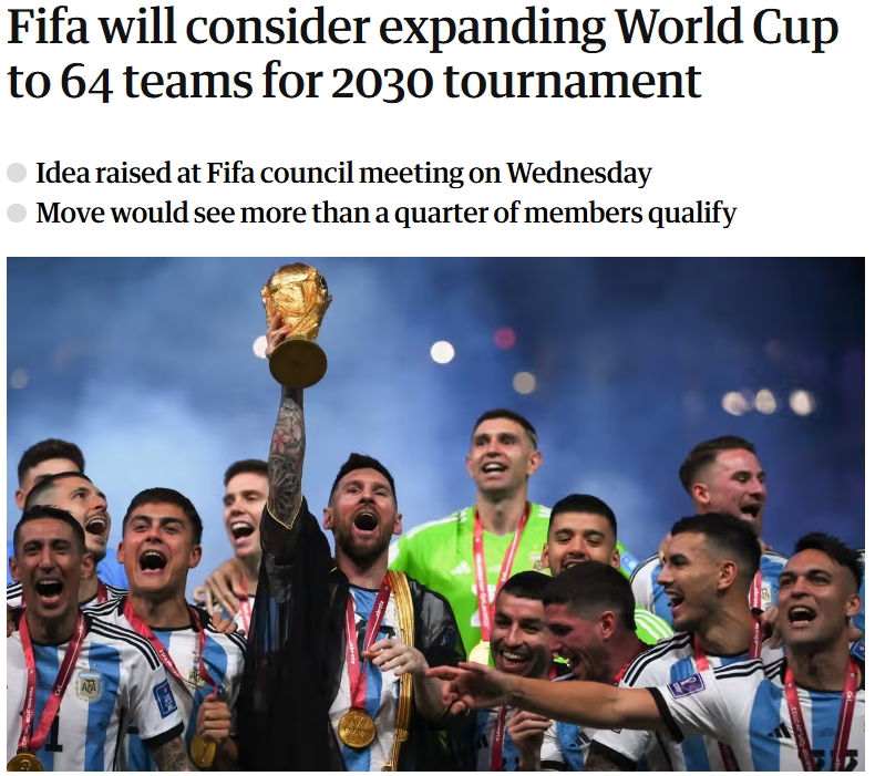 03月07日訊 《紐約時報》等媒體相繼爆料,國際足聯(lián)本周董事會議上有代表提議2030年世界杯擴軍至64隊,以紀(jì)念賽事一百周年。此消息引發(fā)諸多熱議。