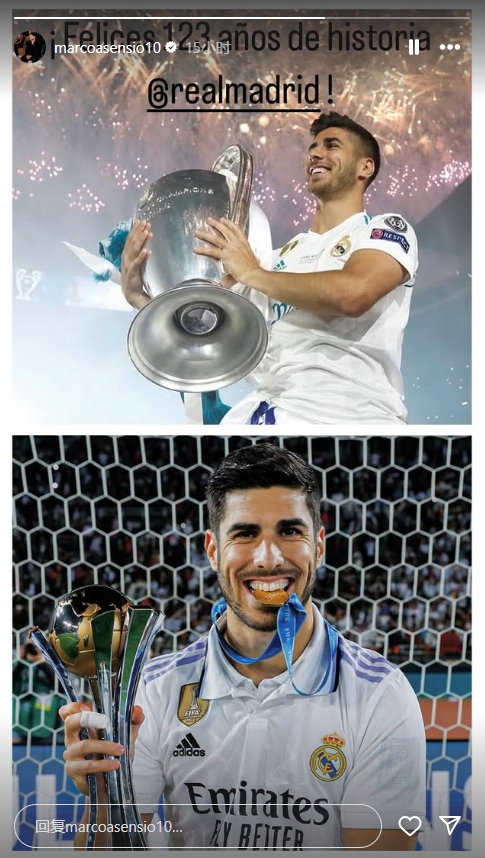 阿森西奧曬出昔日在皇馬捧杯照片,并寫道:“123周年快樂?!?/p>