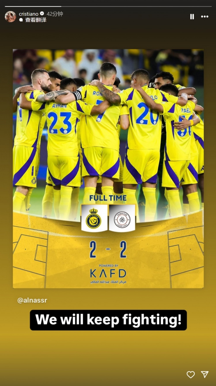 賽后,C羅在個(gè)人社交媒體少出全隊(duì)擁抱的照片,寫道:我們會(huì)繼續(xù)戰(zhàn)斗!