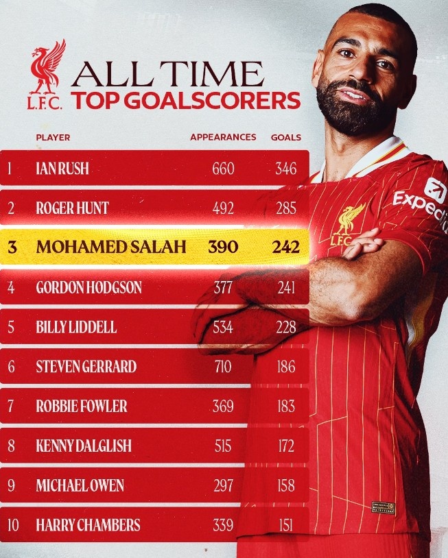 本場(chǎng)比賽取得進(jìn)球后,薩拉赫已經(jīng)為利物浦打進(jìn)242球,躋身紅軍隊(duì)史射手榜第三位。
