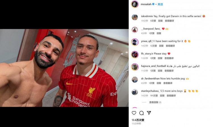 薩拉赫在本賽季比賽后通常都會曬出自己和進(jìn)球隊友的合照,球迷們也調(diào)侃道:“終于輪到努涅斯了。”