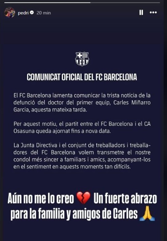 3月9日訊 今天凌晨,巴塞羅那俱樂部宣布一線隊(duì)隊(duì)醫(yī)卡萊斯-米尼亞羅-加西亞不幸離世,而球隊(duì)原定于北京時(shí)間凌晨4:00對(duì)陣奧薩蘇納的比賽也被推遲。