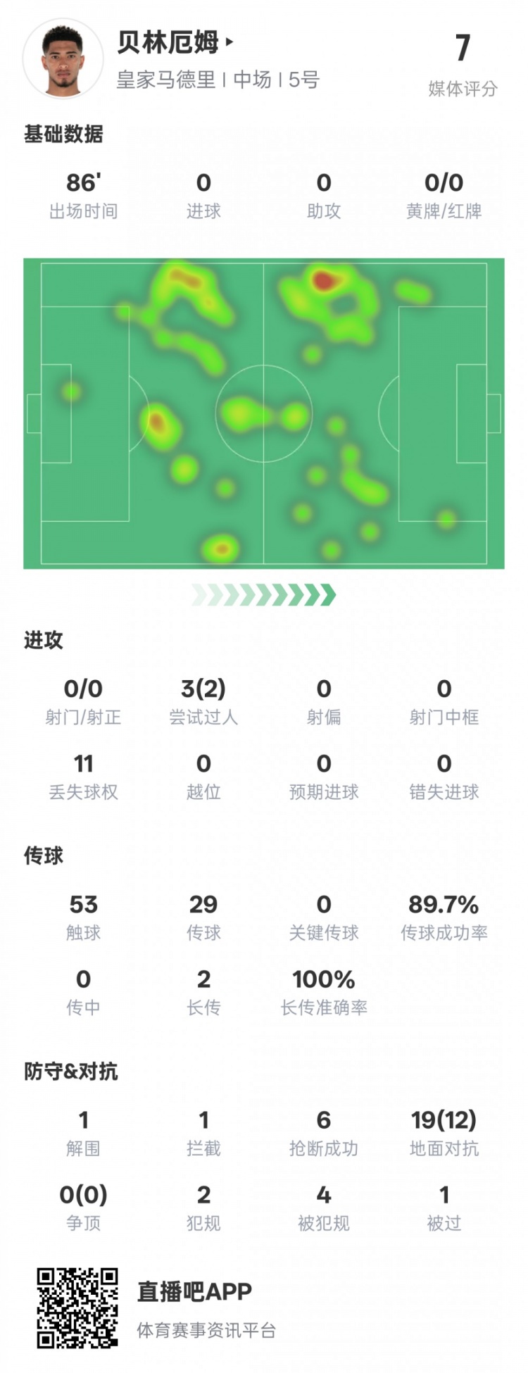 3月10日訊 西甲第27輪,皇馬對陣巴列卡諾,貝林厄姆首發(fā)出戰(zhàn),2次過人成功,12次地面對抗成功,還有6次搶斷,評分7.0。