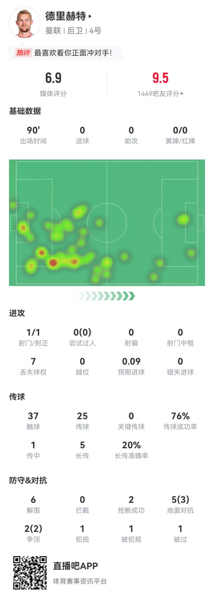 3月10日訊 曼聯(lián)在本輪英超1-1戰(zhàn)平阿森納,德里赫特本場數(shù)據(jù)如下: