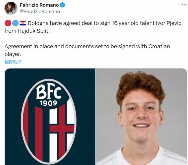 3月11日訊 據(jù)記者羅馬諾消息,博洛尼亞簽下克羅地亞16歲天才伊沃爾-普耶維奇。