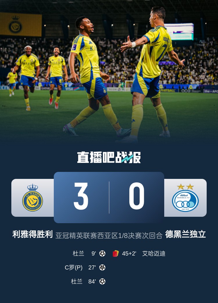 亞冠精英聯(lián)賽西亞區(qū)1/8決賽次回合,C羅進(jìn)球,杜蘭梅開二度,利雅得勝利3-0德黑蘭獨立,晉級亞冠八強(qiáng)。
