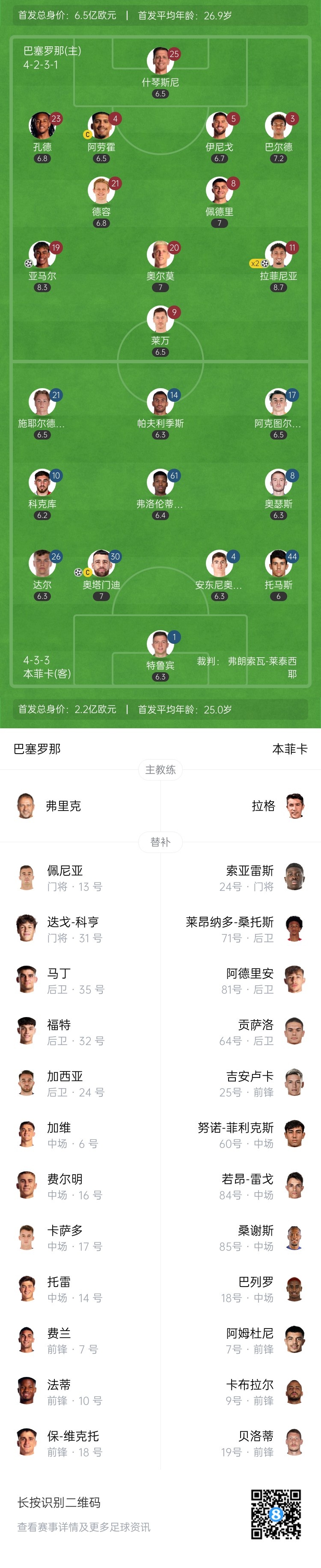 3月12日訊 北京時間1:45,歐冠1/8決賽次回合巴塞羅那主場迎戰(zhàn)本菲卡,首回合巴薩1-0占得先機。比賽在奧林匹克球場打響!上半場,亞馬爾助攻拉菲尼亞破門;奧塔門迪很快扳平;隨后亞馬爾左腳禁區(qū)外兜射破門!巴爾德反擊助攻拉菲尼亞完成雙響!半場結(jié)束,巴薩暫3-1領(lǐng)先本菲卡,總比分4-1!
