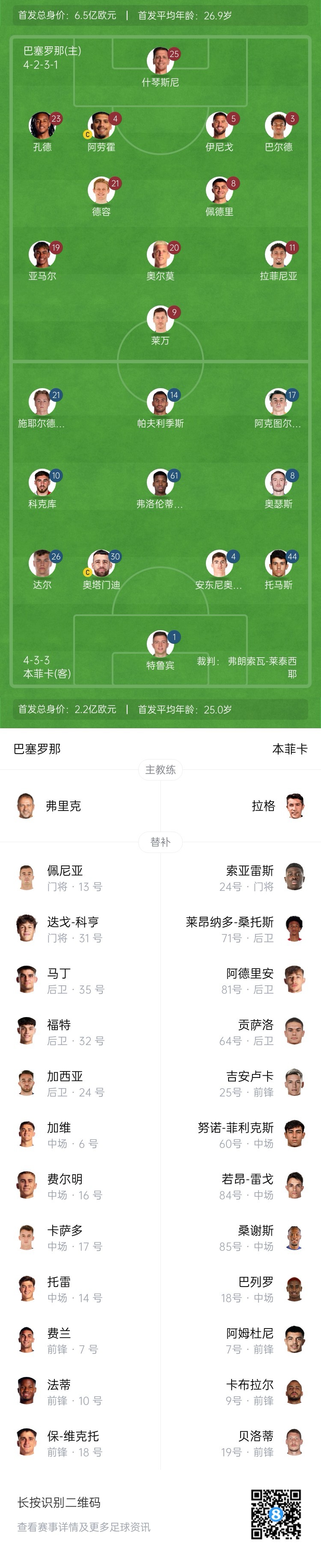 巴薩首發(fā):25-什琴斯尼、3-巴爾德、4-阿勞霍、5-伊尼戈-馬丁內(nèi)斯、23-孔德、21-德容、8-佩德里、20-奧爾莫、19-亞馬爾、11-拉菲尼亞、9-萊萬