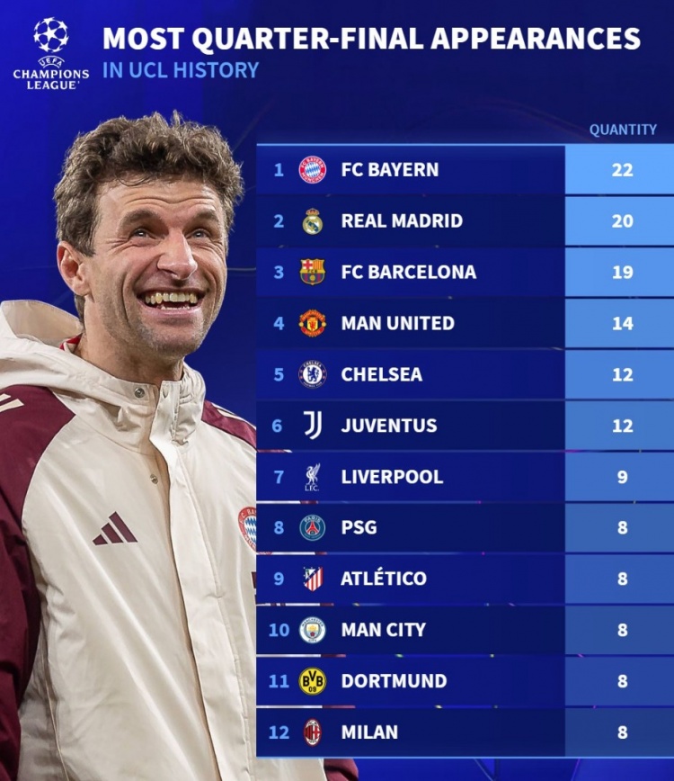 3月11日訊 歐冠十六強戰(zhàn)即將戰(zhàn)火重燃,《轉(zhuǎn)會市場》也列出了改制后歐冠晉級八強次數(shù)情況,拜仁、皇馬、巴薩分列前三。