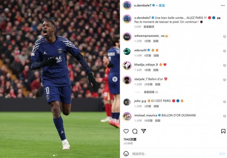 登貝萊也在賽后通過社媒曬出自己的慶祝照,并配文:“真是一個美好的夜晚……巴黎加油?。?!???????? ???????? 沒有時間放松。讓我們繼續(xù)前進吧!”