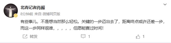 肖赧:“有些事兒,不是想當(dāng)然那么輕松。關(guān)鍵的一步邁出去了,距離終點(diǎn)或許還差一步,而這一步同樣艱難,,,,,但愿能賽過(guò)時(shí)間! ???”