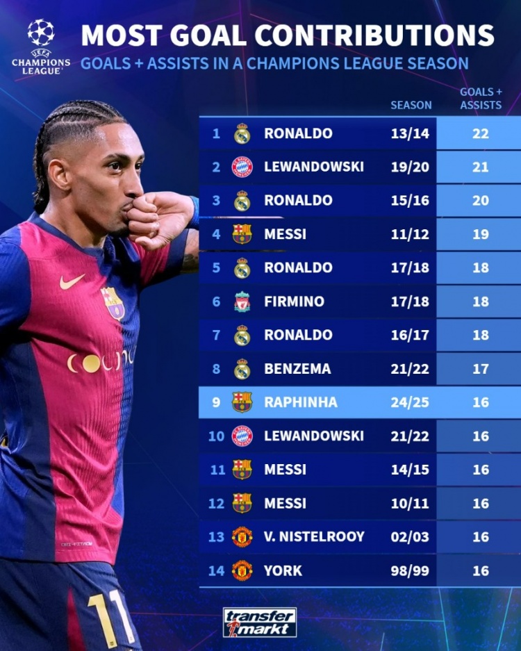 3月12日訊 本賽季拉菲尼亞在歐冠已經(jīng)有11球5助攻,直接參與16球。德轉(zhuǎn)也盤點了歐冠歷史單賽季參與進(jìn)球榜,其中C羅22球居首,具體如下(進(jìn)球+助攻):