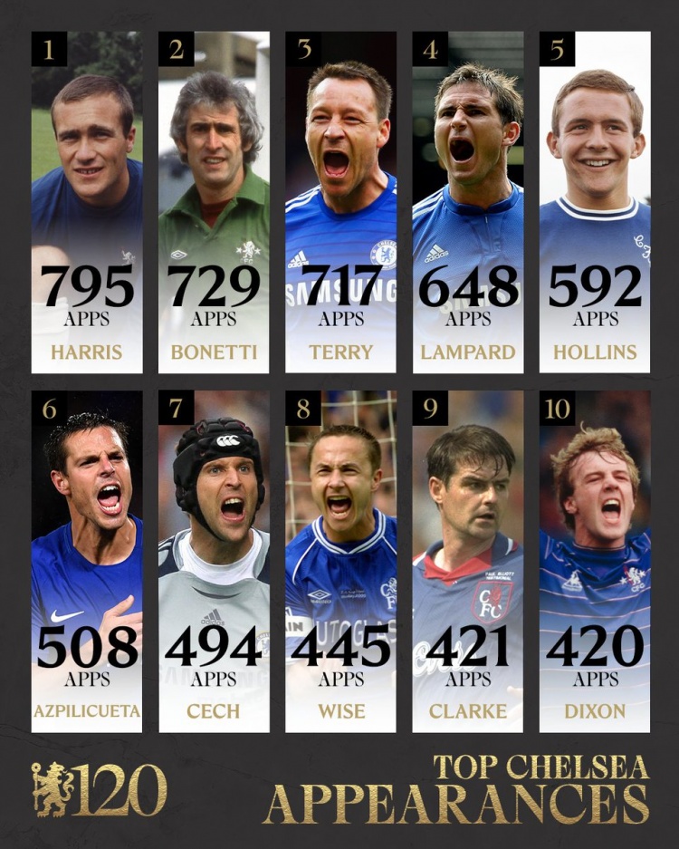 3月12日訊 切爾西俱樂部成立120周年,球隊(duì)官方社媒曬截至目前球員代表球隊(duì)出場次數(shù)榜,羅恩-哈里斯第一,特里第三,蘭帕德第四,AZP第六,切赫第七。