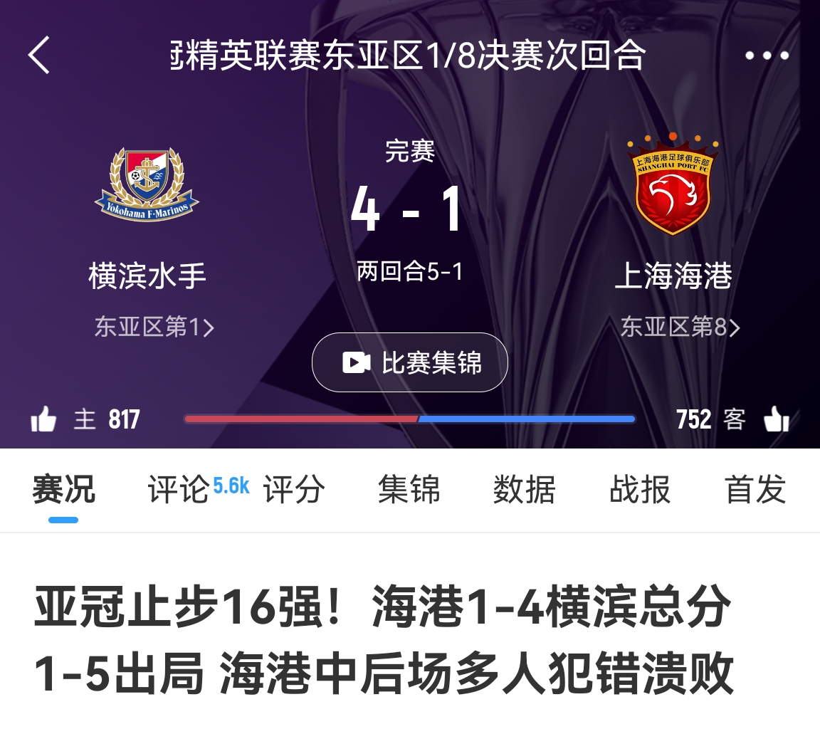 中超冠亞軍!海港昨天客場1-4慘敗橫濱,申花今天客場0-4慘敗川崎