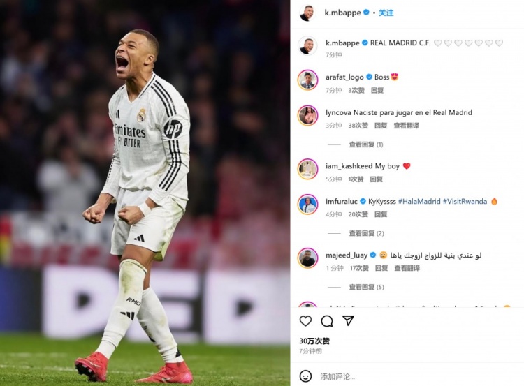 他也在賽后通過社媒曬出自己的怒吼慶祝照,并配文:“皇家馬德里????????????????????????????”