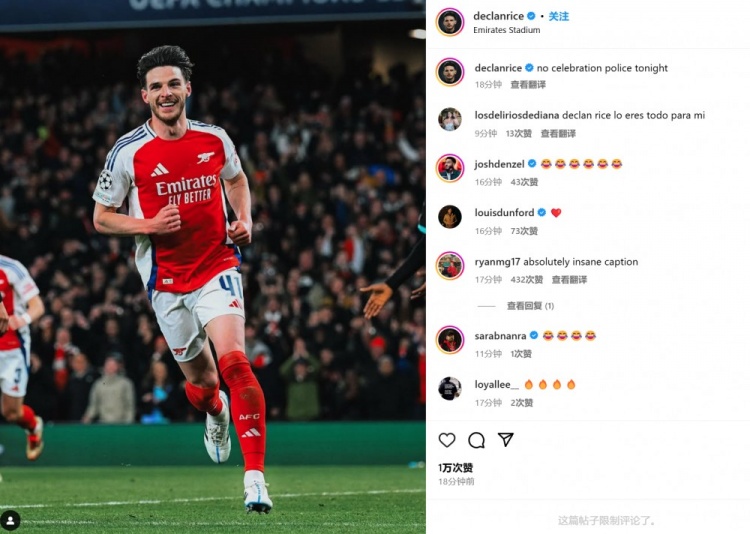 賴斯也在賽后通過(guò)社媒曬出自己進(jìn)球后的慶祝照,并調(diào)侃:“今晚沒(méi)有慶祝動(dòng)作的道德警察?!?/p>