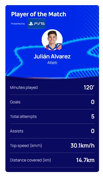 03月13日訊 歐冠1/8決賽次回合,皇家馬德里點球大戰(zhàn)戰(zhàn)勝馬競晉級8強,賽后,馬競前鋒阿爾瓦雷斯當選了全場最佳。